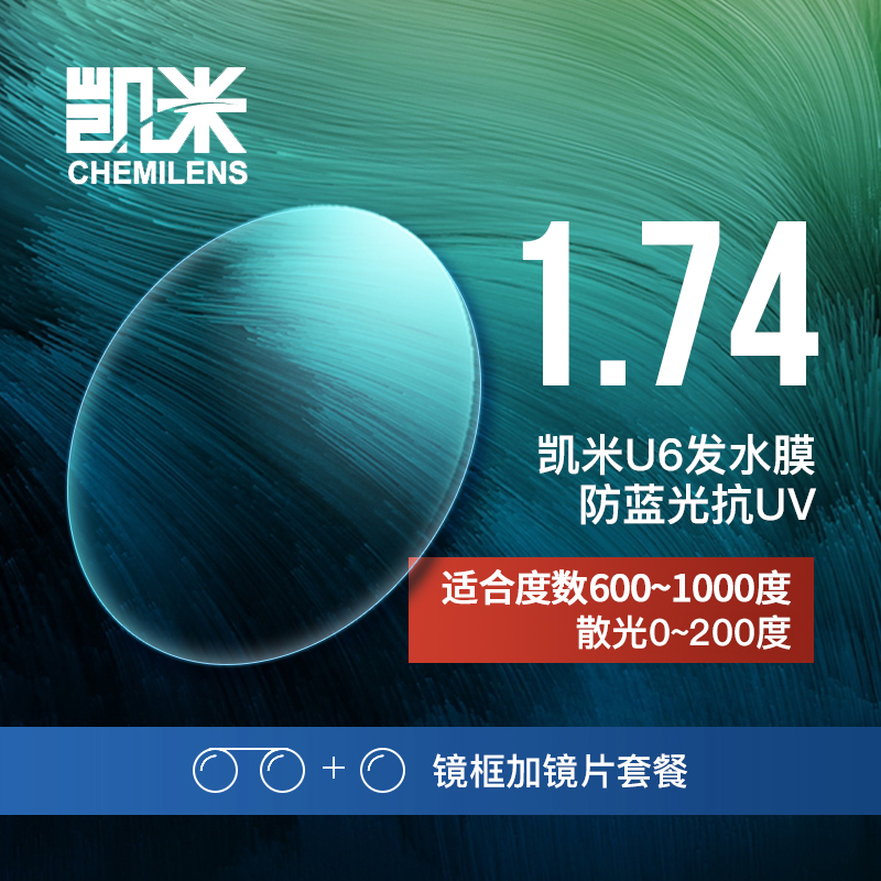镜框+1.74凯米U6无底色防蓝光镜片 600-1000度